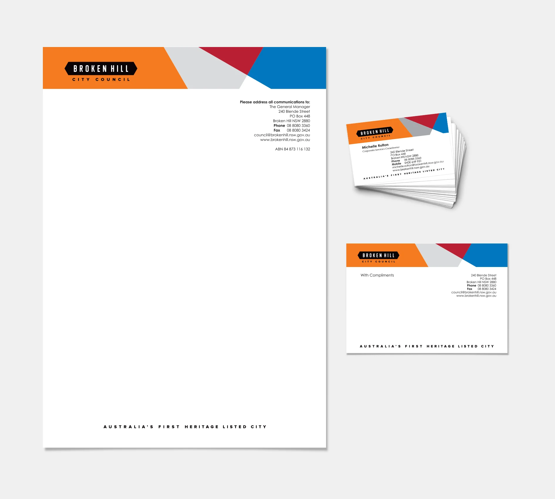 Using the existing ‘Broken Hill City Council’ and ‘Heritage City’ logos as inspiration for the new branding, we created a range of visual components to be used in the Broken Hill City Council’s corporate stationery, management plans, reports and documents, print and digital templates, internal and external signage, website and digital media.